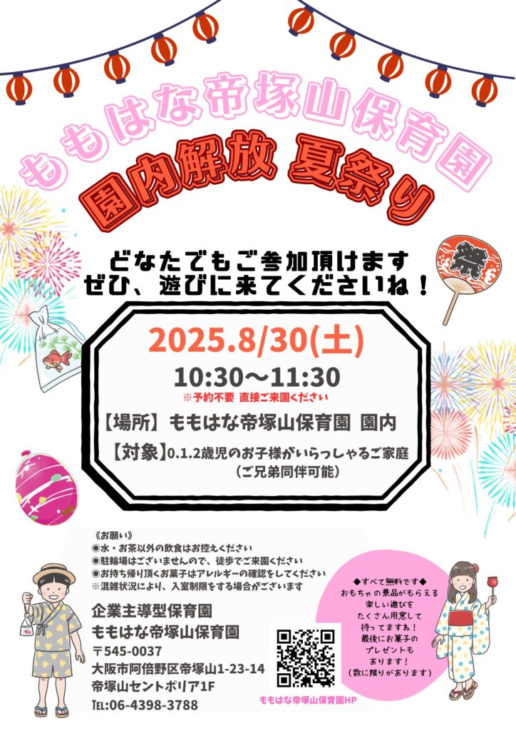 園内開放⭐️ももはな祭り August 4, 2025 毎年行なっているももはな祭りをどなたでもお越し頂ける園内開放とさせて頂きます😊是非ご来園ください!景品が貰える遊びをたくさんご用意して、皆様のご来園をお待ちしております❣️0.1.2歳児のいらっしゃるご家庭限定となります。ご了承ください。(ご兄弟はご同伴頂けます) 保育園等に通われているお子様も大歓迎です。 お願い等、ご確認の上お越しください。